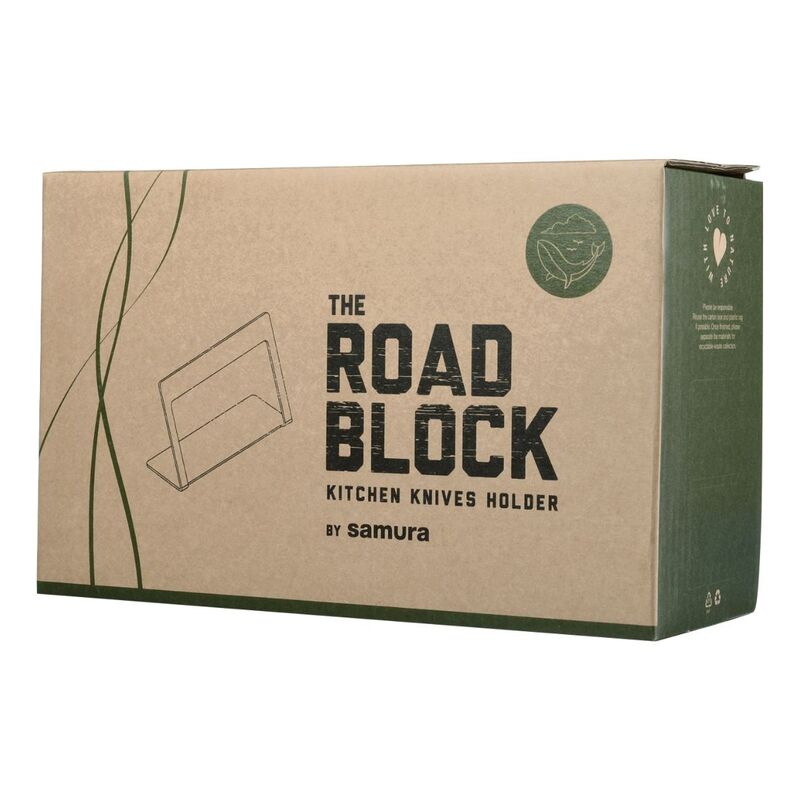 THE ROAD BLOCK by SAMURA is a magnetic knife holder made of black steel, featuring a powerful magnet that is 100% hand crafted. Steel is a permanent material that can be infinitely recycled without any loss of quality. THE ROAD BLOCK is truly a pinnacle of the knife holder evolution. Its sleek, modern, space saving design saves valuable countertop and workbench space, accenting any kitchen decor. It will never rust and never lose its powerful magnetic charge and is easy to clean. The block stores up to 7 knives of different sizes.