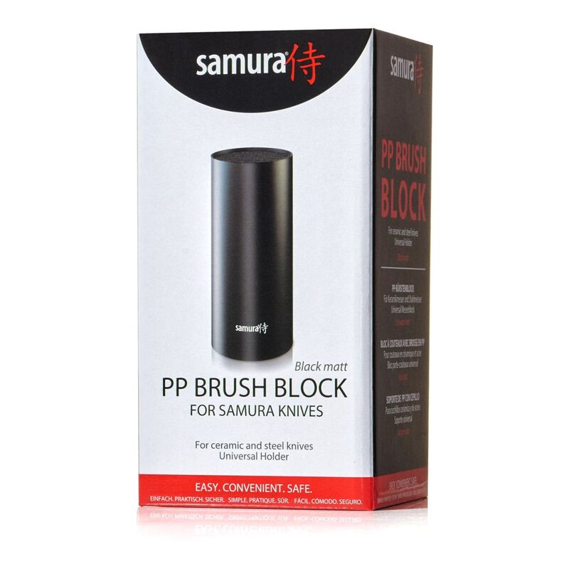 THE BRUSH BLOCK by SAMURA is a knife block made to use little space while storing your knives safely in a stylish, compact manner.