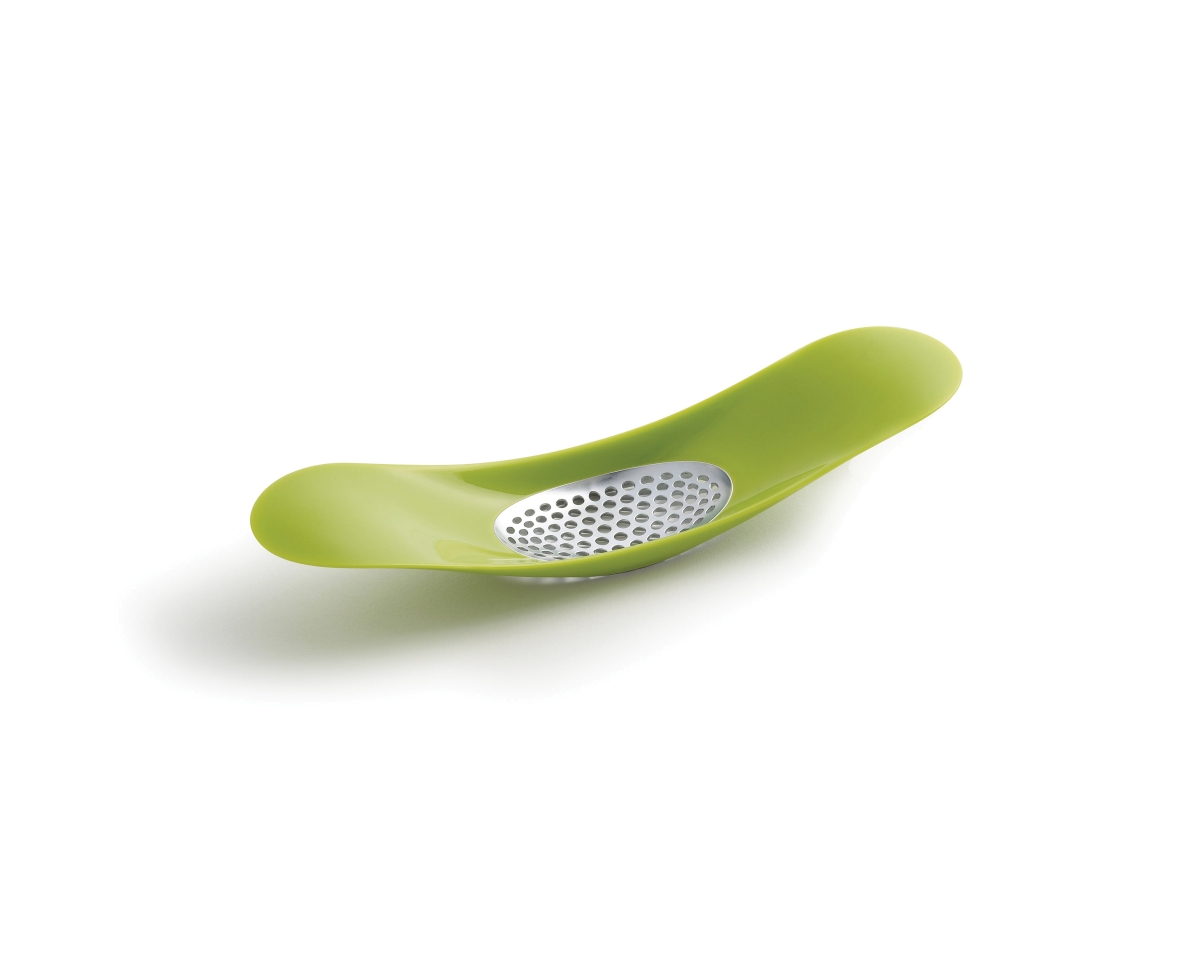 By using downward pressure and a 'rocking' motion, this stylish tool breaks up garlic cloves quickly and easily, forcing the pieces up through the mesh of holes in its base.