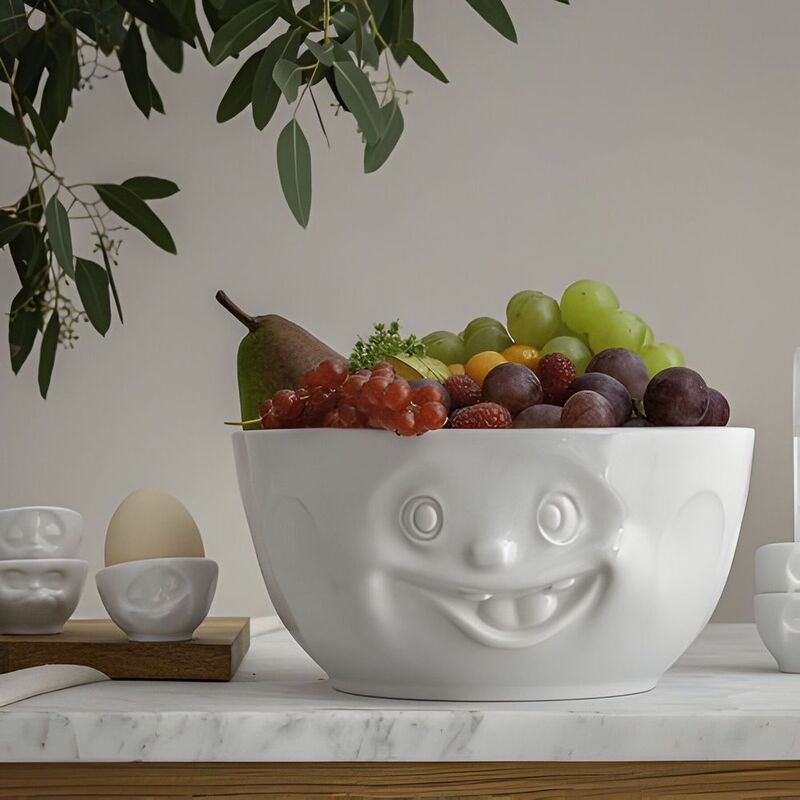 Serve big smiles in this large-sized bowl from the TASSEN product family of fun dishware by FIFTYEIGHT Products. At a whopping 87.5 oz capacity, this quirky porcelain bowl features a sculpted ‘out of control' facial expression.
