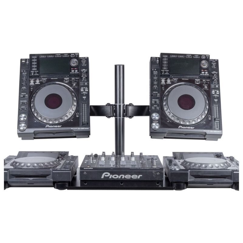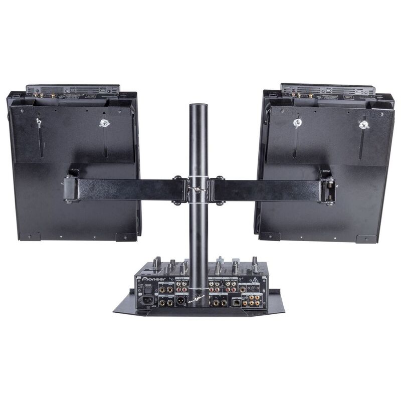 The Headliner Avalon Dual CDJ Stand is a sturdy and durable space-saving stand designed to elevate your media players, leaving room for turntables or additional decks on either side of your mixer. The twin CDJ arms are fully adjustable to find the perfect height and position for any space. They set in place with a secure bolt locking system to keep them from moving around during performances and can be set up to 19-Inches above your work surface.