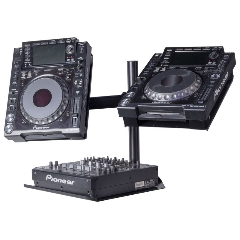 The Headliner Avalon Dual CDJ Stand features a heavy-duty powder coated base plate that will accommodate mixers up to 16 deep and 16.5 inches wide, including most models from Pioneer and Allen & Heath Xone.