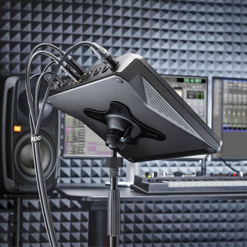 The VESA Mount is a sturdy adjustable mount for products fitted with VESA mounting screws, such as the Rode caster pro II and Rode caster duo.It features a locking ball head that can rotate 360 degrees for easy manoeuvring of the device in any orientation. The mount attaches to any standard microphone stand or studio arm, and is the perfect way to position your device in a range of scenarios.