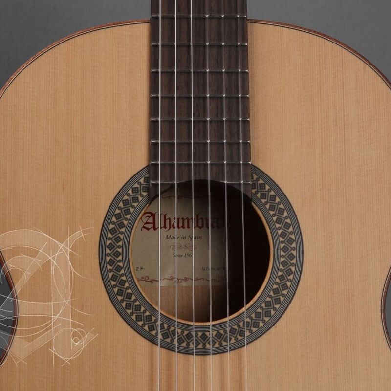 The 2 F model is a wonderful guitar. Finished with open pore varnish and with a solid cedar top, its sonority will draw your attention. Very powerful and with a truly flamenco sound.
