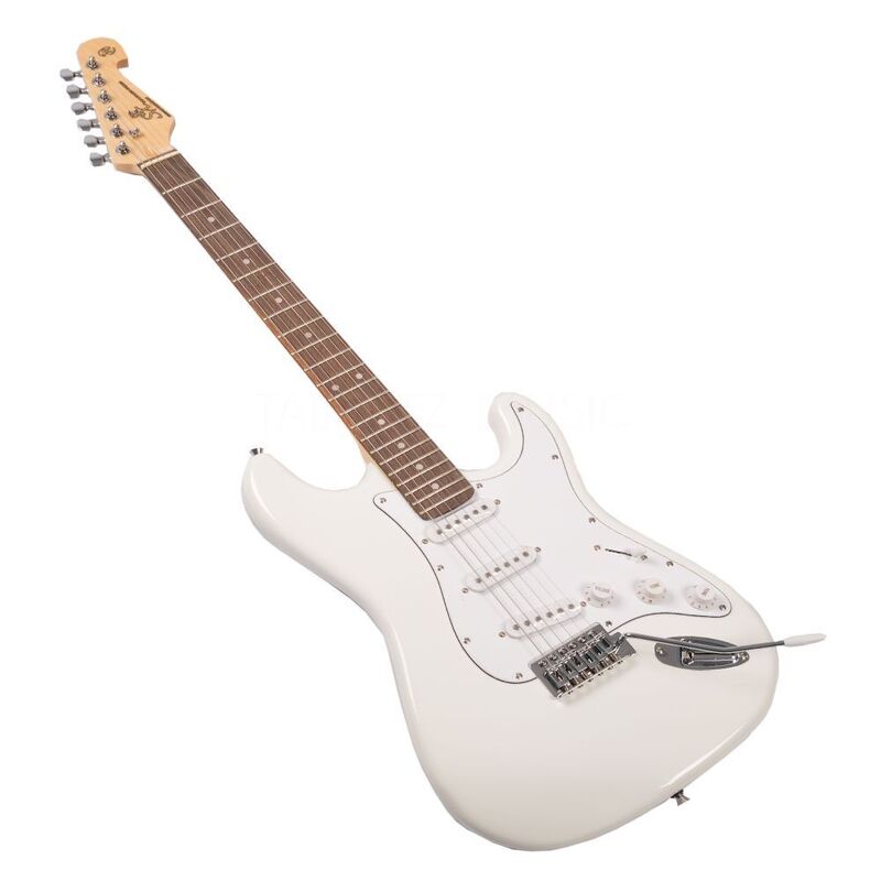 A popular strat style electric guitar in stylish white finish and includes bag!