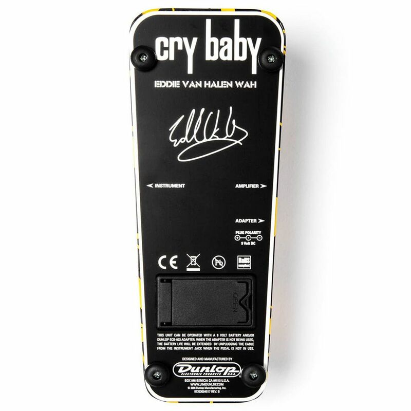 The EVH95 Signature Crybaby Wah Pedal is a member of the celebrated EVH Signature Series that was developed after intensive design collaboration with the legendary guitarist Eddie Van Halen. Early on in the process, Eddie handed over his "Holy Grail" Crybaby--a standard Crybaby customized in the early Nineties with a more vocal-like, High Q inductor and a wider frequency sweep. Amazingly, Dunlop found that over the years Eddie's unique wah style, which uses mostly the middle range of the effect pedal's action, had carved his own curve into the pot's resistive element, making the middle range even more defined and increased the low end sweep. Dunlop's clones of the worn-in pot and hand-selected inductor give the EVH-95 the same "Holy Grail" feel and tone, and it's true hardwire bypass, dual bright blue bypass LEDs, and graphics based on the black and yellow-striped guitar featured on Van Halen II round out this EVH-approved Crybaby Wah Pedal with a voice and look all its own.