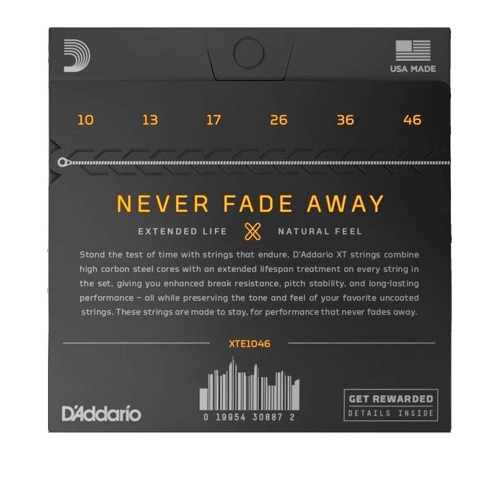 XT Nickel coated electric guitar strings offer enhanced break resistance, better pitch stability, and longer-lasting performance than standard electric strings. The XT coating, applied to each string in the set, delivers advanced corrosion resistance, while still retaining the bright tone and natural feel of the uncoated string. Beneath the coating, XT Nickel are made with a NY Steel core, nickel-plated steel wrap wire, and Fusion Twist technology, resulting in added resilience and tonal versatility, excellent for a wide range of musical styles. 10-46 Regular Light is our most popular XT gauge, providing a nice balance of tone and playability.