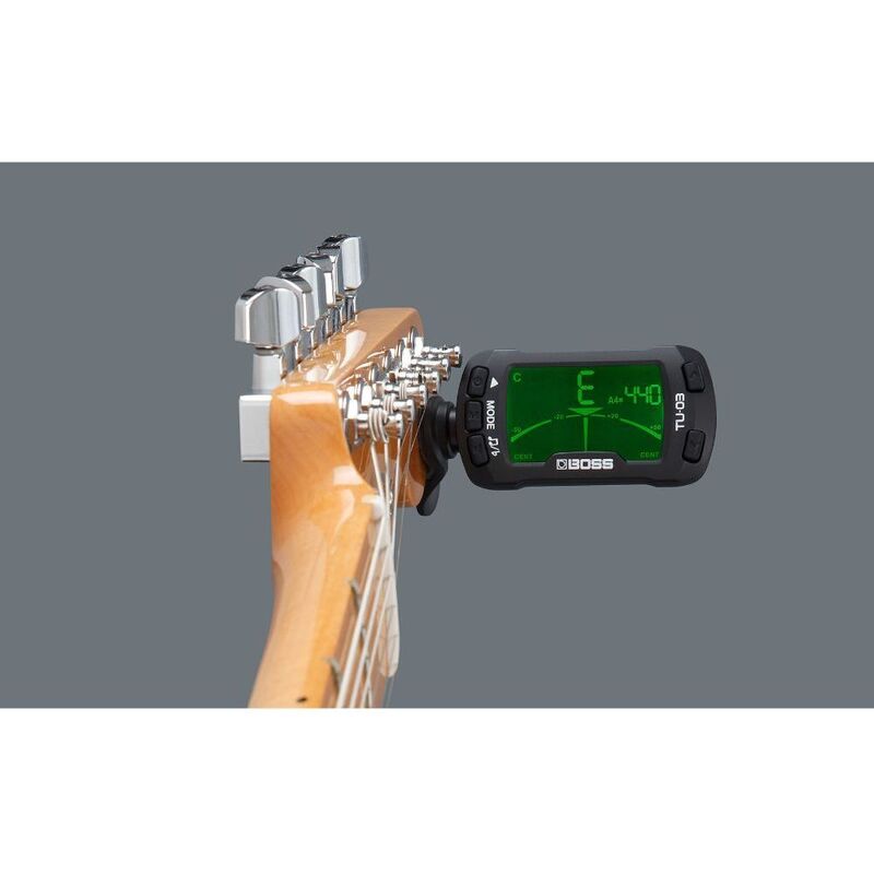 The TU-03 is rugged, reliable, and built to last, with a spring-loaded clip and flexible pad that provides secure, stable attachment on all types of headstocks. And thanks to its integrated backlight and non-glare surface, the display is easy to view in any environment, from dark stages to bright sunlight.