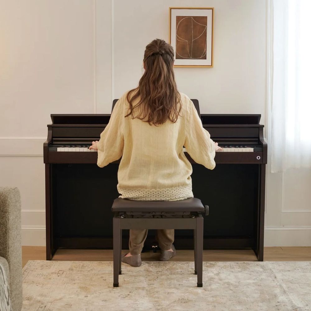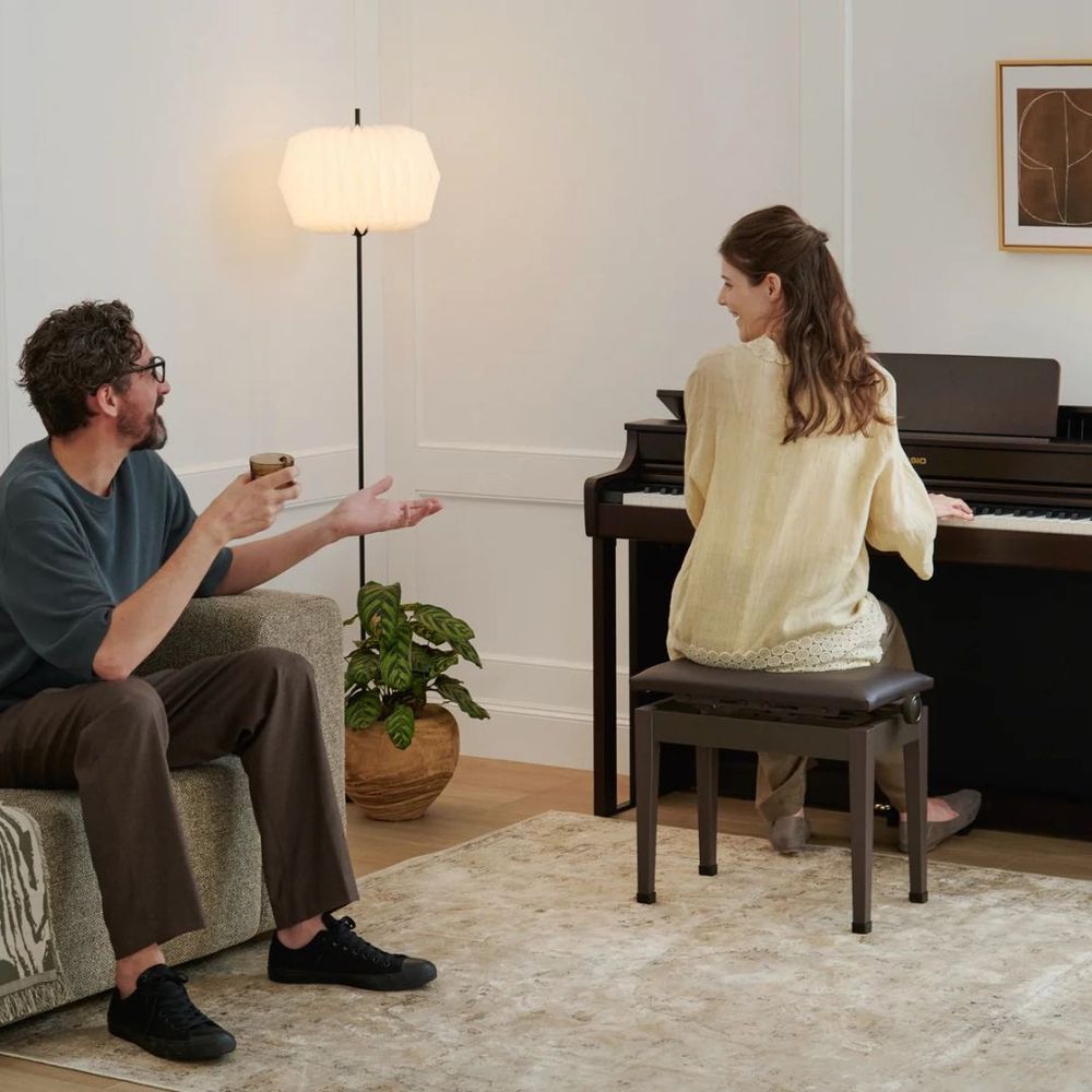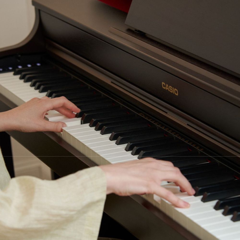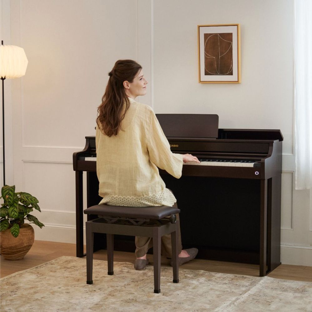 The Casio CELVIANO AP-300 blends classical elegance with modern innovation, powered by the Multi-Dimensional Morphing AiR Sound Source for rich, expressive tones. Its Smart Scaled Hammer Action Keyboard with textured ebony/ivory keys delivers authentic touch and nuanced playability. A 2-channel speaker system with Volume Sync EQ ensures immersive resonance at any volume, while Sound Mode and Headphone Mode enhance both performance and practice. Three pedals replicate grand piano control, offering precision and stability. With wireless MIDI & Audio connectivity and the CASIO MUSIC SPACE app, the AP-300 expands creative possibilities. Compact, stylish, and expressive, it’s the perfect entry into the piano world.
