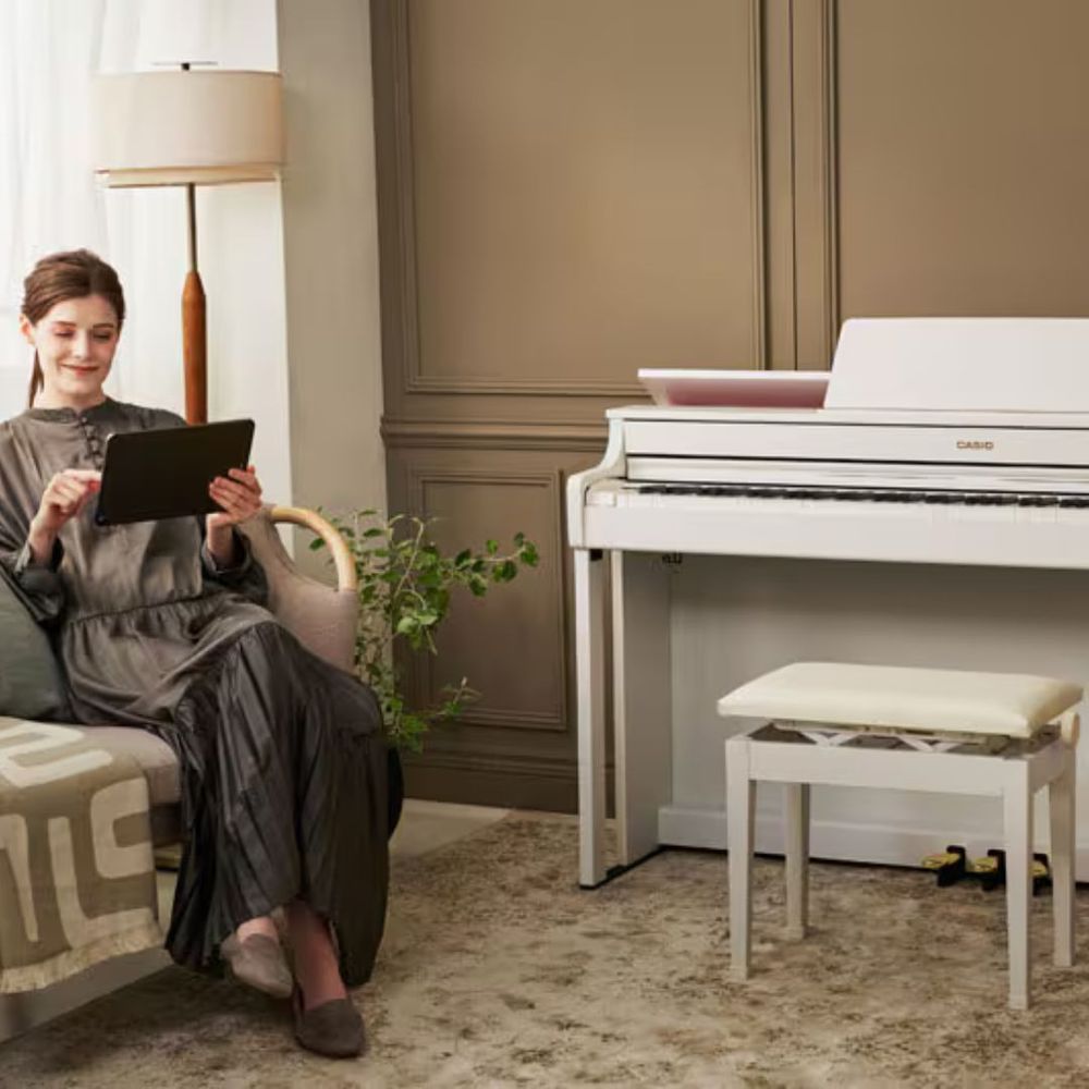 The Casio CELVIANO AP-300 blends classical elegance with modern innovation, powered by the Multi-Dimensional Morphing AiR Sound Source for rich, expressive tones. Its Smart Scaled Hammer Action Keyboard with textured ebony/ivory keys delivers authentic touch and nuanced playability. A 2-channel speaker system with Volume Sync EQ ensures immersive resonance at any volume, while Sound Mode and Headphone Mode enhance both performance and practice. Three pedals replicate grand piano control, offering precision and stability. With wireless MIDI & Audio connectivity and the CASIO MUSIC SPACE app, the AP-300 expands creative possibilities. Compact, stylish, and expressive, it’s the perfect entry into the piano world.