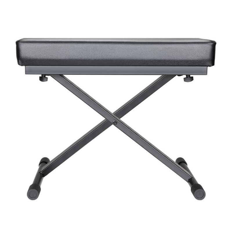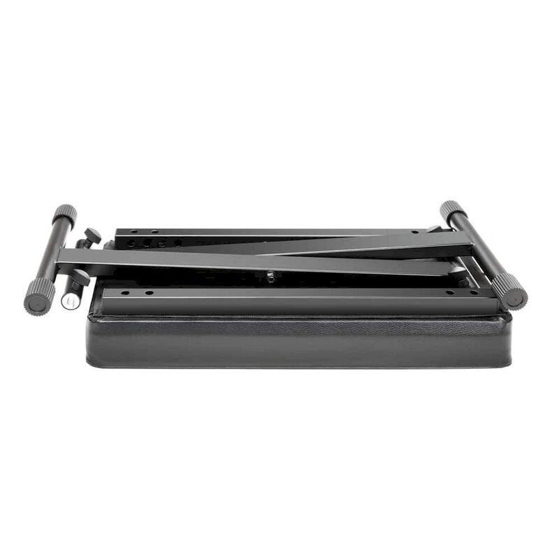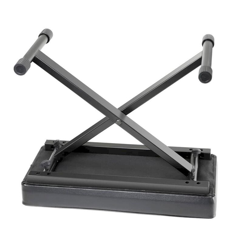 The SKT 17 is an ultra comfortable single X brace keyboard bench with a 52 x 24 cm high density foam padded seating area and adjustable height from 36 to 52 cm. The durable construction is made of black powder coated heavy duty steel. The legs feature non-slip rubber ends and fold completely flat for easy transport and space saving storage.