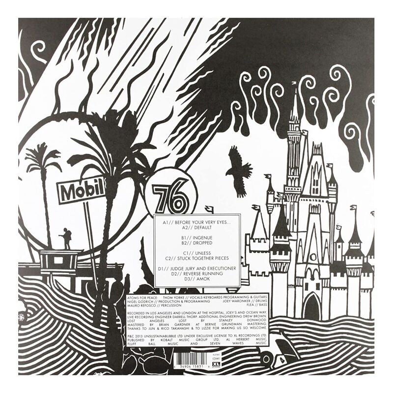 Vinyl LP pressing. 2013 release from this side project from Radiohead's Thom Yorke. Atoms for Peace is Yorke, Nigel Godrich, Mauro Refosco, Joey Waronker, and Flea. They came together by playing in support of Thom's Grammy nominated album the Eraser. They got a big buzz from those shows and discovered loads of energy from transforming the music from electronic to live, so they carried on for a few days in the studio and decided to make it a loose, on-going thing... since everyone in the band has a day job as well.
