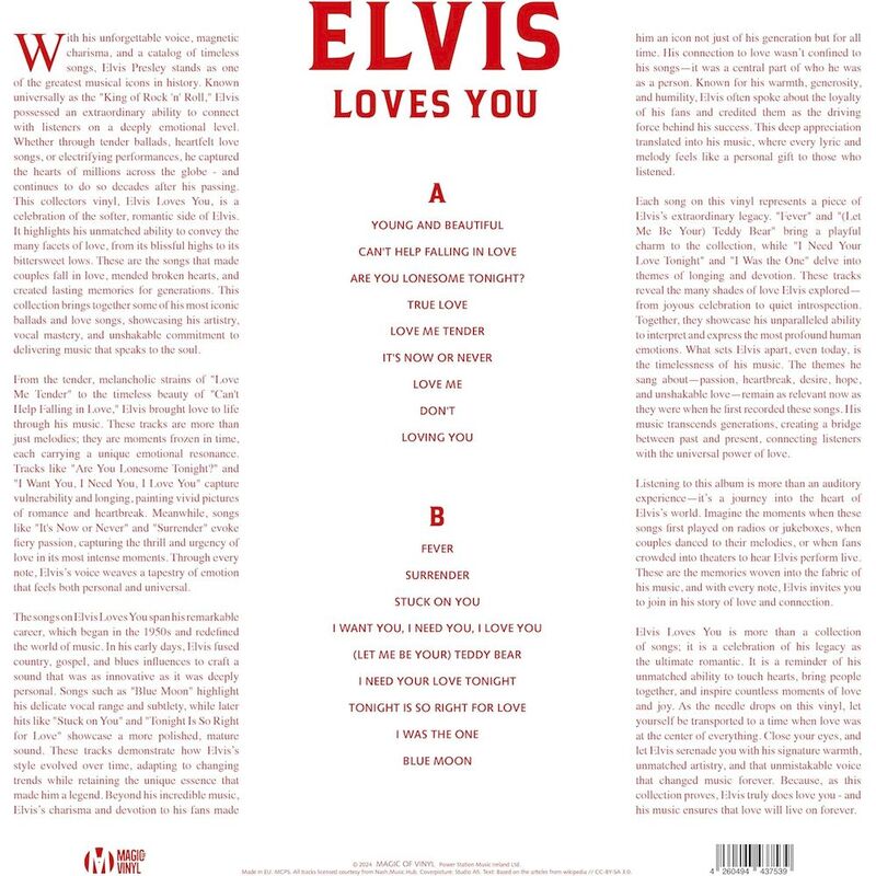 Elvis Loves You is more than just a collection of the King's love songs - it's a tribute to the legacy of the ultimate romantic. It is a reminder of Elvis Presley's unique ability to touch hearts, bring people together and provide countless moments of love and joy. From the tender strains of "Love Me Tender" to the timeless beauty of "Can't Help Falling in Love," each song captures emotions that are both intimate and universal. Songs like "Are You Lonesome Tonight?" and "I Want You, I Need You, I Love You" reflect vulnerability and longing, while "It's Now or Never" and "Surrender" embody the passionate moments of love. Close your eyes and let Elvis enchant you with his unmistakable warmth and unique voice that changed music forever. As this collection impressively proves: Elvis really loves you - and his music makes this love live on forever.