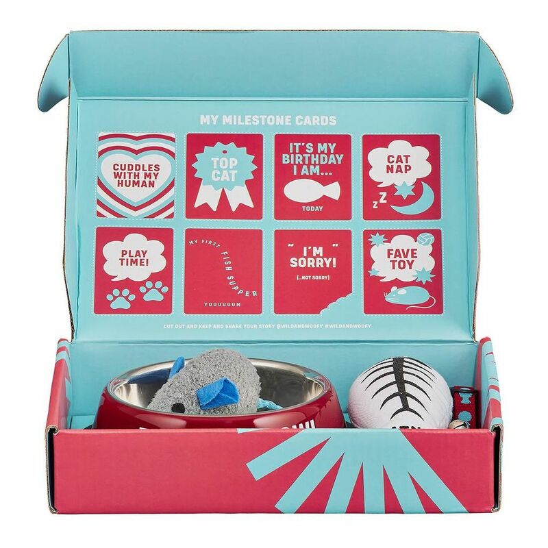 Eat, Sleep, Purrr, Repeat! Welcome your new feline friend to the family with this New Cat Starter Kit from Wild & Woofy! Purr-fect gift for a new cat owner! Has everything to make your new kitty feel at home. Set includes fish print collar with a bell, mouse toy, catnip fish toy and metal bowl. Box measures 9inch W x 7.25inch L x 2.75inch H.