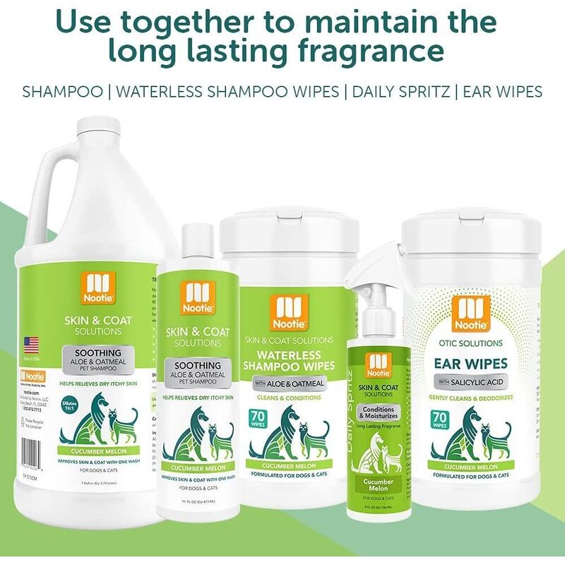 For a great moisturizing grooming shampoofor pets. Vitamin and oil enriched to give coats a shiny and soft texture, this shampoo also leaves a long lasting delicious scent that's unforgettable.Soothing - The fresh scent of cucumber melon combined with aloe and oatmeal helps relieve dry, itchy skin while leaving your dog smelling fresh and clean. Nootie Cucumber Melon Pet Shampoo is made with natural ingredients and is soap and paraben free. No sulfates or harsh chemicals for gentle cleansing.Dilutes 16-1- Long lasting fragrance- Made with natural ingredients- Soap & paraben free- No sulfates or harsh chemicals- Safe to use along with topical flea & tick productsIngredientsPurified Water, Decyl Glucoside, Coco Betaine, Glycerin, Polyquat 7 (Conditioner), Oatmeal Extract, Aloe Concentrate, infused with essence of Cucumber Melon, Preservative1 Gallon