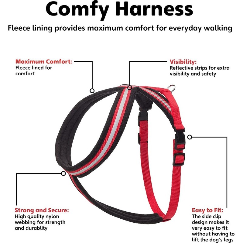 Made from high grade quality nylon, the Comfy Harness is extremely strong and fleece lined for maximum comfort. It is very easy to use, and the adjustable chest strap ensures a perfect fit for your dog.