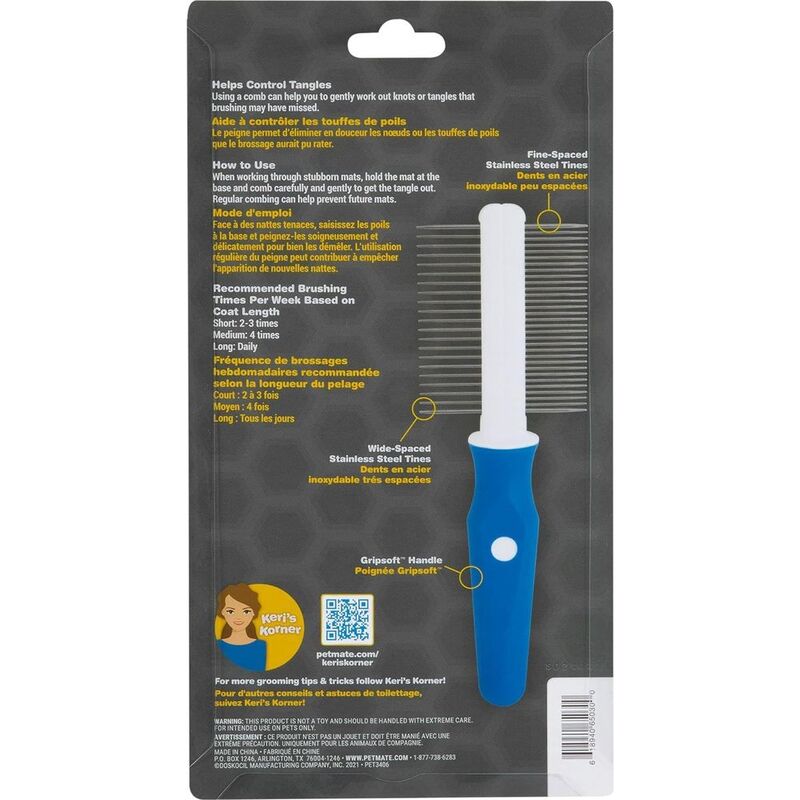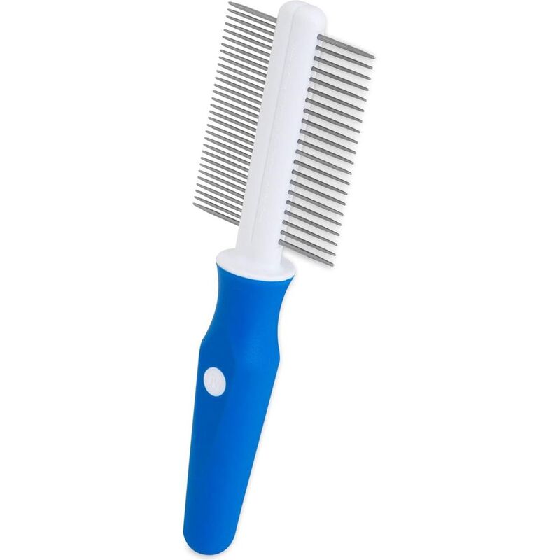 The Grip Soft Double Sided Comb has a Coarse Comb on one side to loosen dense matted fur and a Fine Comb on the other side to comb through hair to give a shiny silky tangle free finished coat. JW combs are specially designed with the teeth turned 90 degrees away from the skin to keep the teeth parallel to the skin while combing. This prevents raking" the skin while combing and is more comfortable for your pet."