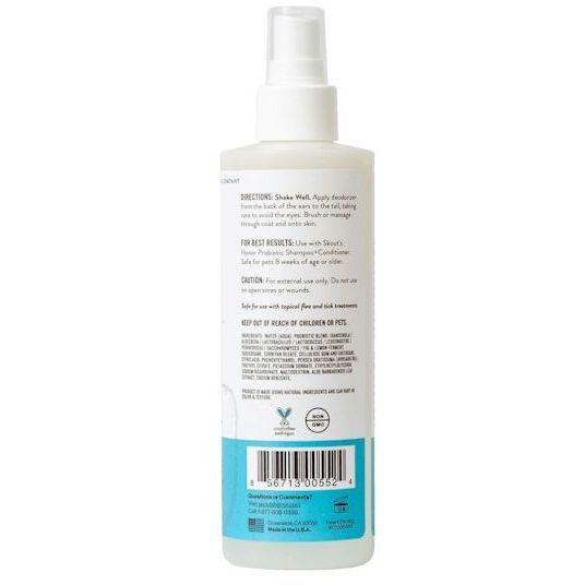 The Skouts Honor® Unscented Probiotic Deodorizer with avocado oil is designed to support against shedding, itching, dryness, hot spots and odour by hydrating and deodorizing the skin and coat. Can be used daily. 98.5% natural Conditioning omega-3S Paraben & Sulfate Free PH Balanced for dogs Tear free Non GMO Cruelty free & vegan.