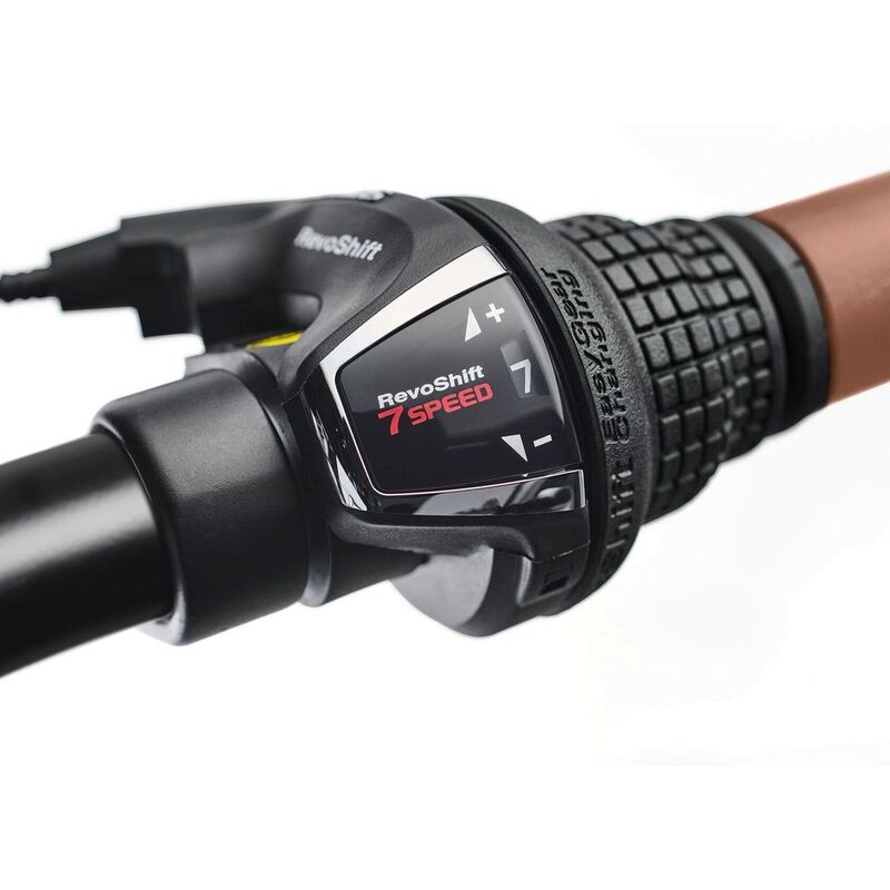• The Shimano Revo shifter delivers smooth gear shifting, helping to climb hills easily. Brakes control deceleration for swift stopping, while 26-inch Bontrager tires roll smoothly turning the ride into an unforgettable experience