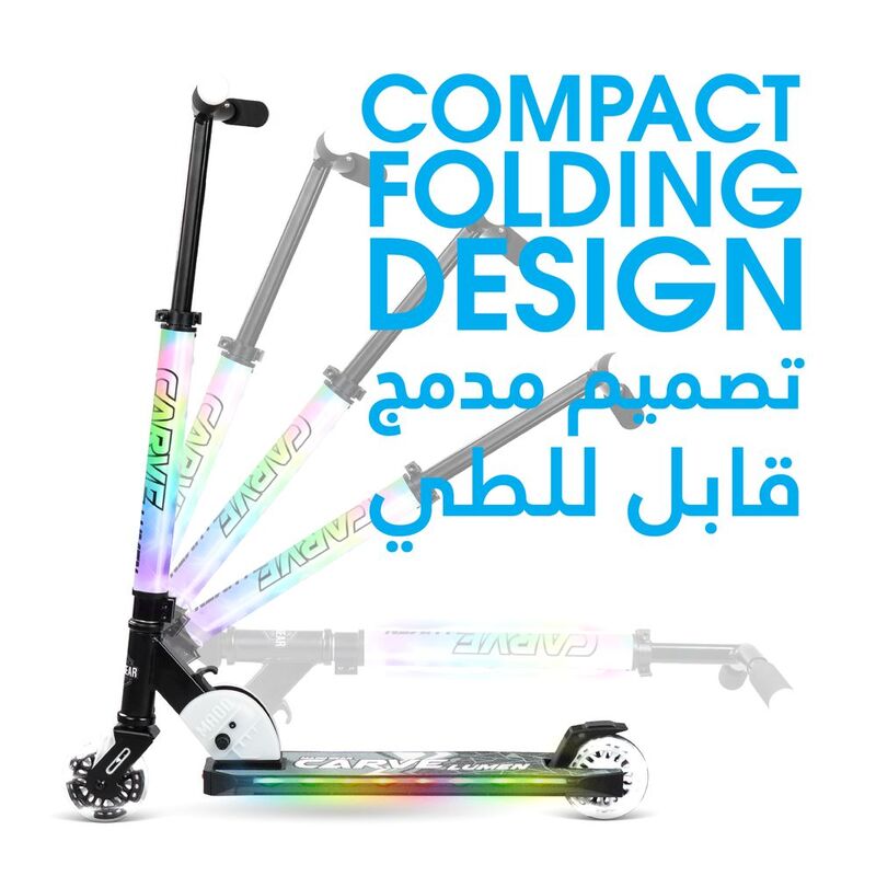 The Carve Lumen scooter has a customizable three stage height adjustable eclipse handlebar embedded with bright LED lights topped with comfortable non-slip handlebar grips. The Madd Gear Easy-Fold system makes storage and transport a breeze and is ready to ride in seconds!