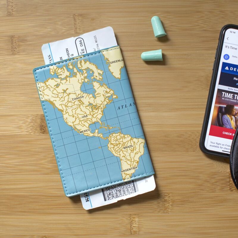 Add to your travel experience with this world map-inspired passport case. Folded up, it keeps your passport, and travel documents all safe and in one place. Made of Leatherette with RFID blocking technology.