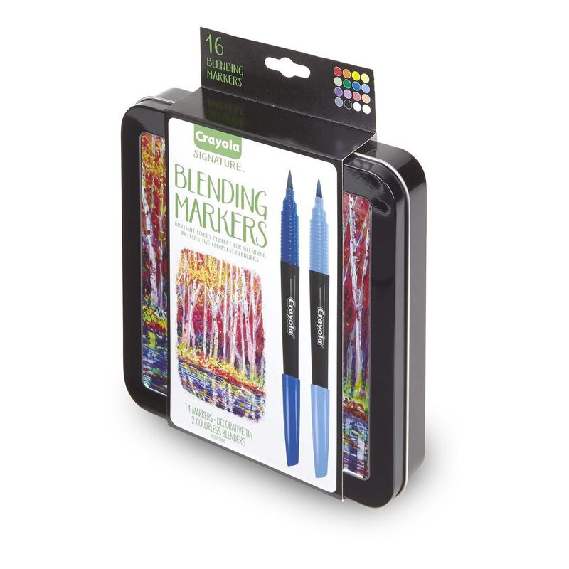 Crayola signature blending markers provide great creative versatility in coloring and art projects. Sketch, draw, add texture, and blend colors for unique outcomes. A great technique for taking your adult coloring to the next level! Includes 14 markers in brilliant colors (7 colors in light and dark variations), 2 colorless blending markers and a decorative storage tin.