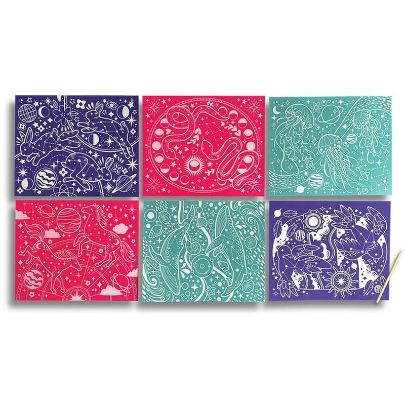 - Includes 6 colored scratch cards with intricately detailed images inspired by constellations