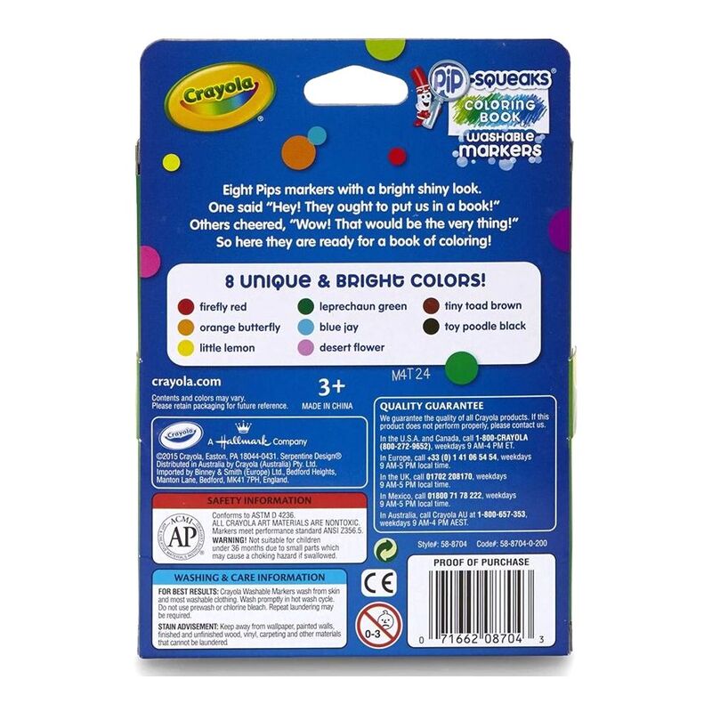 The eight colours in this pack of Crayola Pip-Squeaks Markers go beyond traditional primary colours. Unique colours such as firefly red, orange butterfly, little lemon, leprechaun green, blue jay, desert flower, tiny toad brown, and toy poodle black inspire creativity and encourage one-of-a-kind artwork.