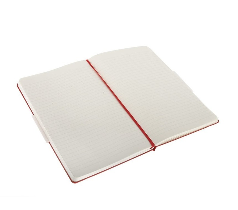 Like its black best selling counterpart, it has a cardboard bound cover with rounded corners, acid free paper, a bookmark, an elastic closure and an expandable inner pocket that contains the Moleskine history.