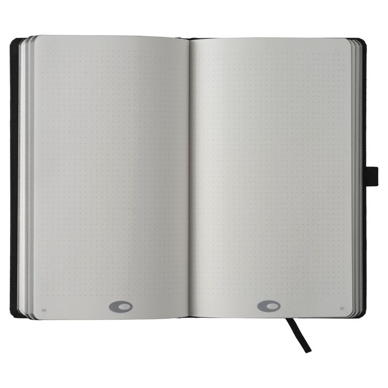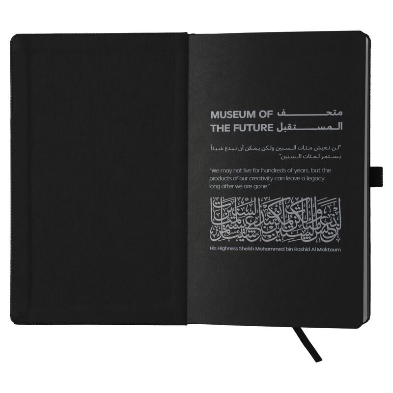 Inspiring calligraphy illustrating We may not live for hundreds of years, but the products of our creativity can last even longer is printed around this A5 notebook.
