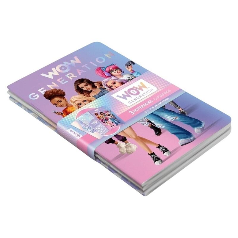 Pack of 3 A5 softcover notebooks ideal for your child's new school year with the most modern WOW Generation designs. These 3 notebooks are perfect for taking notes at school or to write down any personal information. Very modern designs to make your daughter feel like a total WOW girl. The notebooks consist of 25 sheets of 100 gr each, and the inside designs are: one totally blank, another one with small squares and the last one with lines.