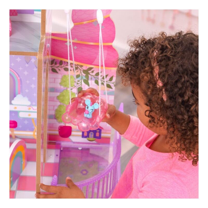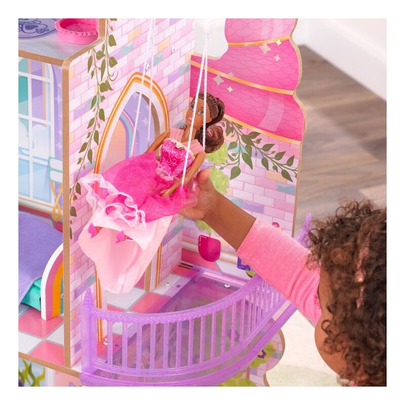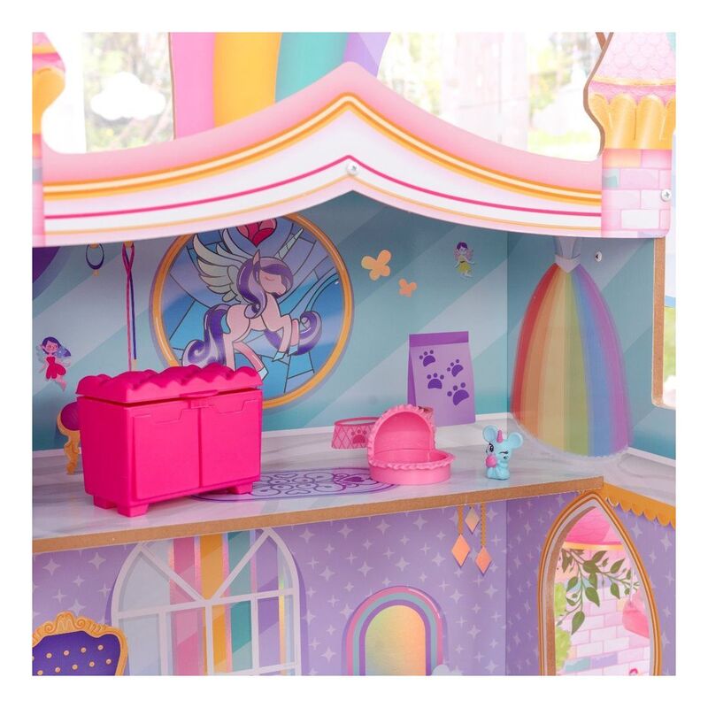 Magic reigns, uniqueness is celebrated, and make believe comes to life in the KidKraft Rainbow Dreamers Unicorn Mermaid Dollhouse. Welcome all one-of-a-kind creatures to this three-story dollhouse. Follow the rainbow to discover a real working swing suspended from a cloud. Shimmering walls are a delightful backdrop to the cheerful furniture. Slide down to enter the mermaid lounge, complete with ornate seashell chairs. A cute Mousicorn friend is with you for every journey. From sky to sea, fantasy worlds collide in the loveliest way in the almost 4-foot-tall Rainbow Dreamers Unicorn Mermaid Dollhouse.