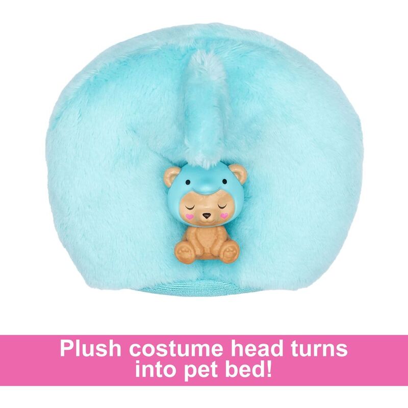 - Kids can dress and style Barbie doll by reversing the costume top to find a super-soft fleece jacket with a trendy print. The costume head turns into a bed for the mini pet friend, too!