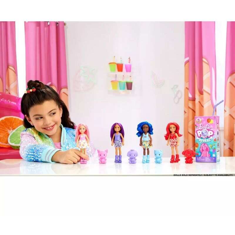 Barbie Pop Reveal Chelsea dolls offer an unboxing experience filled with five fun surprises! Pop the top of the juice box packaging with the straw-like piece to smell one of four scents in the Fruit Series -- strawberry lemonade, fruit punch, watermelon crush or grape fizz. Which doll will you reveal? Unbox to find a scented Chelsea small doll, two mystery bags and an ice cube with a surprise inside -- pop it to discover roller skates! The ice cube is reusable -- repeat the pop reveal fun again and again. Open the bags to find a skirt and a squishy, pop-it pet, then discover more wow with color-change transformation on Chelsea doll's face. Kids will want to collect them all! Each doll sold separately, subject to availability. Dolls cannot stand alone. Colors and decorations may vary.