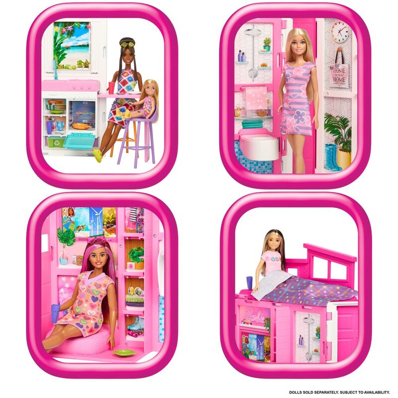 This cute, colourful, and foldable Barbie doll house inspires oodles of fun and countless getaway adventures! It comes with a Barbie doll, as well as charming accessories for decorating. With four play areas to spark storytelling -- a kitchen, bathroom, loft bedroom and movie corner -- the Barbie Getaway House is a perfect gift for kids ages 3 years old and up! Colors and decorations may vary.