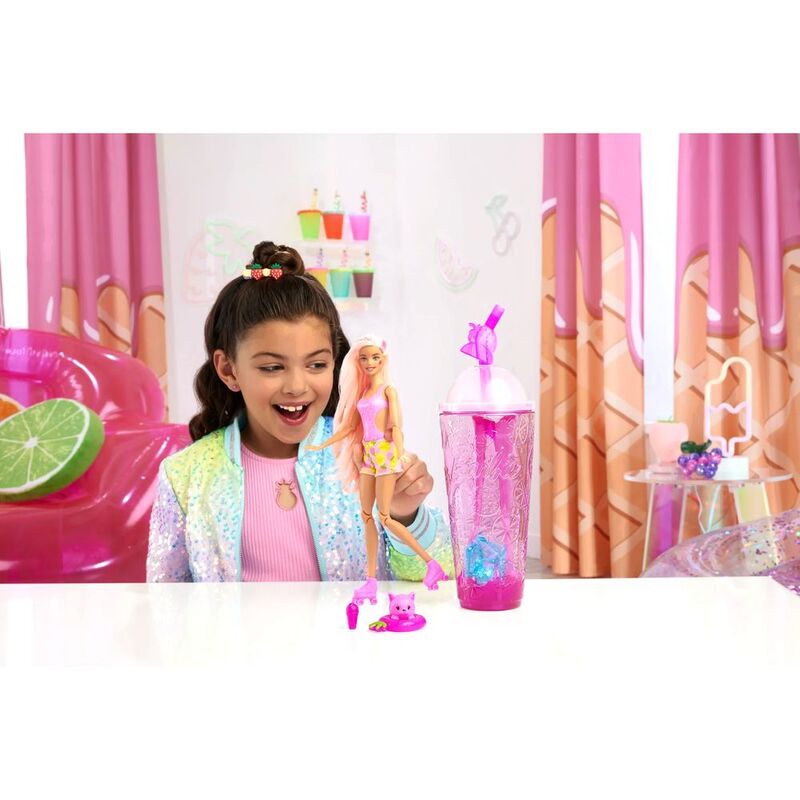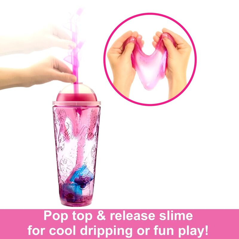 Barbie® Pop Reveal™ dolls offer an unboxing experience filled with eight sensory surprises! Which doll will you reveal? Unwrap the drink cup-inspired packaging to find one of four flavors in the Fruit Series -- strawberry lemonade, fruit punch, watermelon crush or grape fizz. Open the lid and remove the surprise bags, then pop the top and watch colorful Slime™ drip down over the ice cubes that hold accessories inside. Kids can take the squishy Slime™ out for fun, sensory play. Next, pop the ice cubes to find roller skates and a squishy mini-drink piece. The ice cubes are reusable -- repeat the pop reveal fun again and again! Kids keep unboxing to find a fruit-scented fashion doll, a squishy and scented pet, fashion piece and accessories. Each Pop Reveal Barbie™ doll is posable with color-change hair and makeup. Kids will want to collect them all! Each doll sold separately, subject to availability. Dolls cannot stand alone. Colors and decorations may vary.