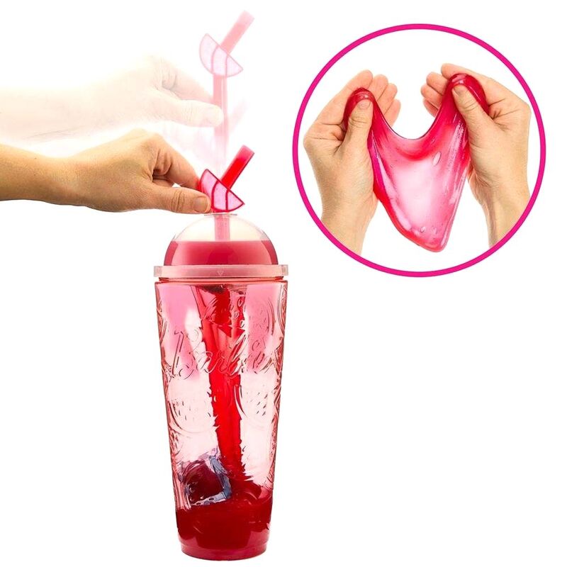 - Kids remove the outer layer of packaging, open the cup and pull out the surprise bags, then screw the lid back on and pop the top with the straw-like piece to release squishy, red Slime over the ice cubes!