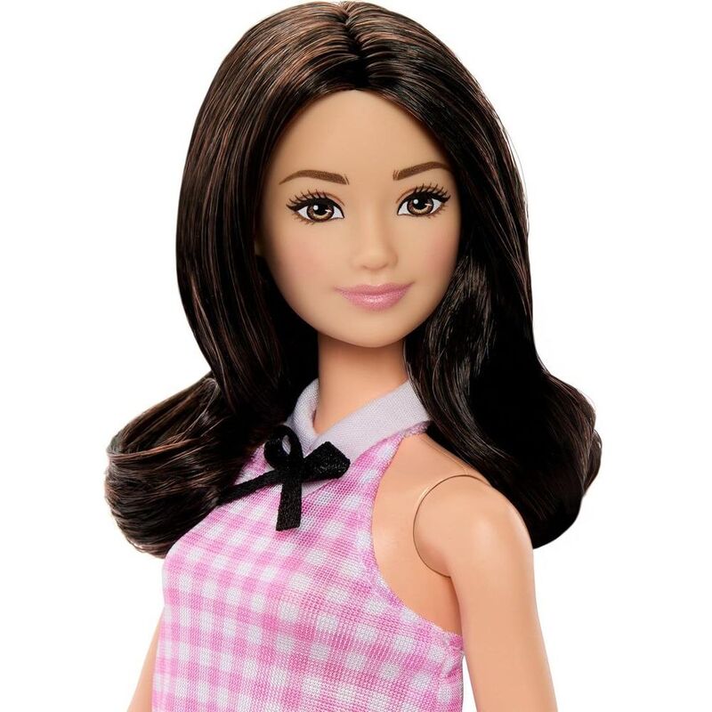 - Inspired by her 1973 Quick Curl look, the Barbie Fashionistas doll wears a pink plaid dress with sweet ruffles and a tie collar