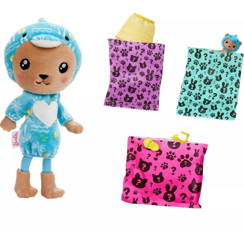 Barbie Cutie Reveal costume-themed series Chelsea dolls offer the cutest unboxing experience with six surprises! Discover a Kitten in a Red Panda costume, a Dog as a Frog, a Teddy Bear as a Dolphin or a Bunny as a Koala. Remove the plush costume to reveal a Chelsea doll. Which doll will you reveal? Get cozier with more surprises like a skirt and mini pet that matches the doll's costume. Flip the plush top for an over-sized jacket and the costume head for a pet bed. Icy cold water adds even more cuteness with color-change transformation on the mini pet; warm water changes it back for repeat fun! Kids will love discovering all the surprises in this cozy cute Barbie Cutie Reveal series. Each doll sold separately, subject to availability. Dolls cannot stand alone. Colors and decorations may vary.