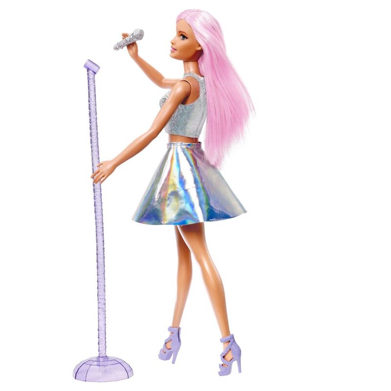 • Barbie® pop star doll is ready for the stage in an outfit that will help her shine -- a sparkly silvery top, iridescent skirt, trendy purple shoes and long pink hair.