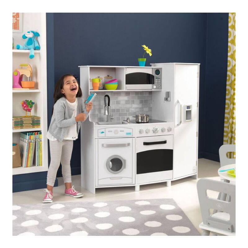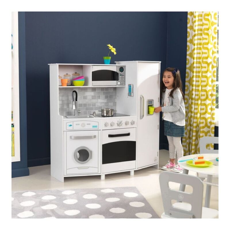 The large play kitchen with lights and sounds is ideal for children who like to cook with their parents. Includes an ice maker that makes realistic sounds with flashing lights, acrylic hobs and a microwave, a pull-out faucet