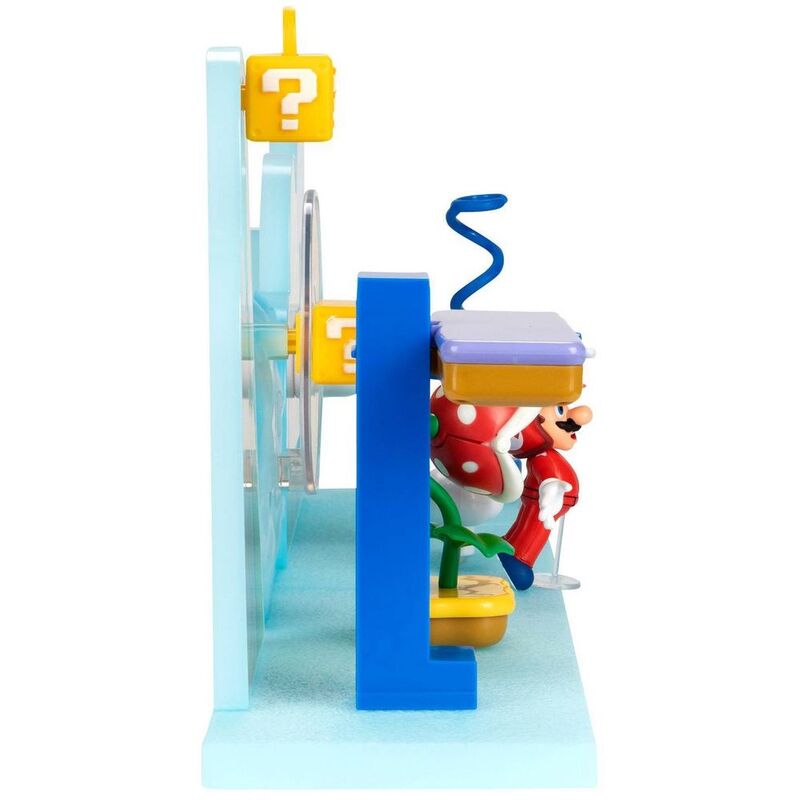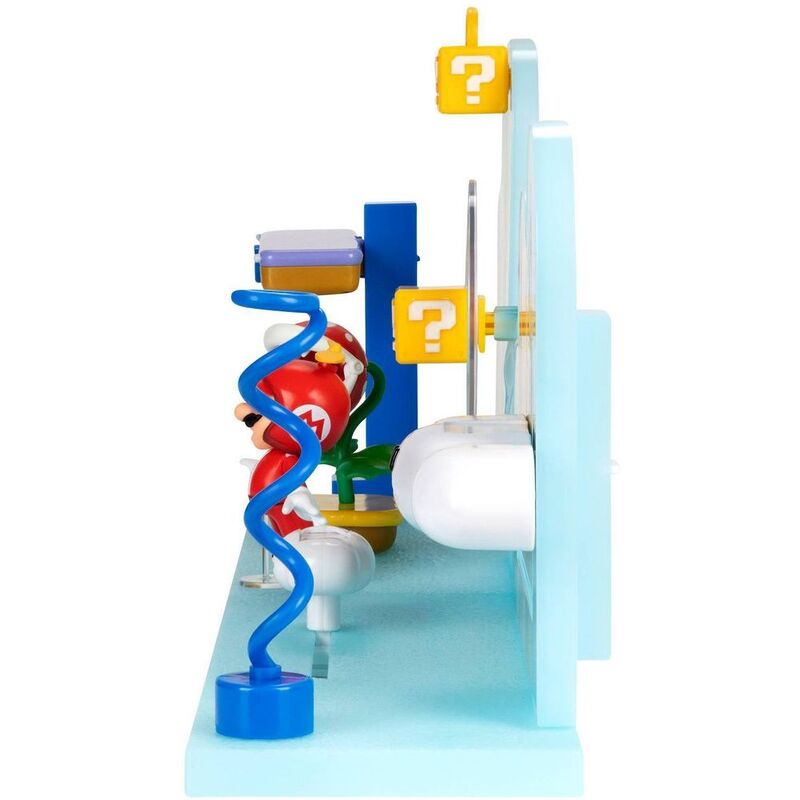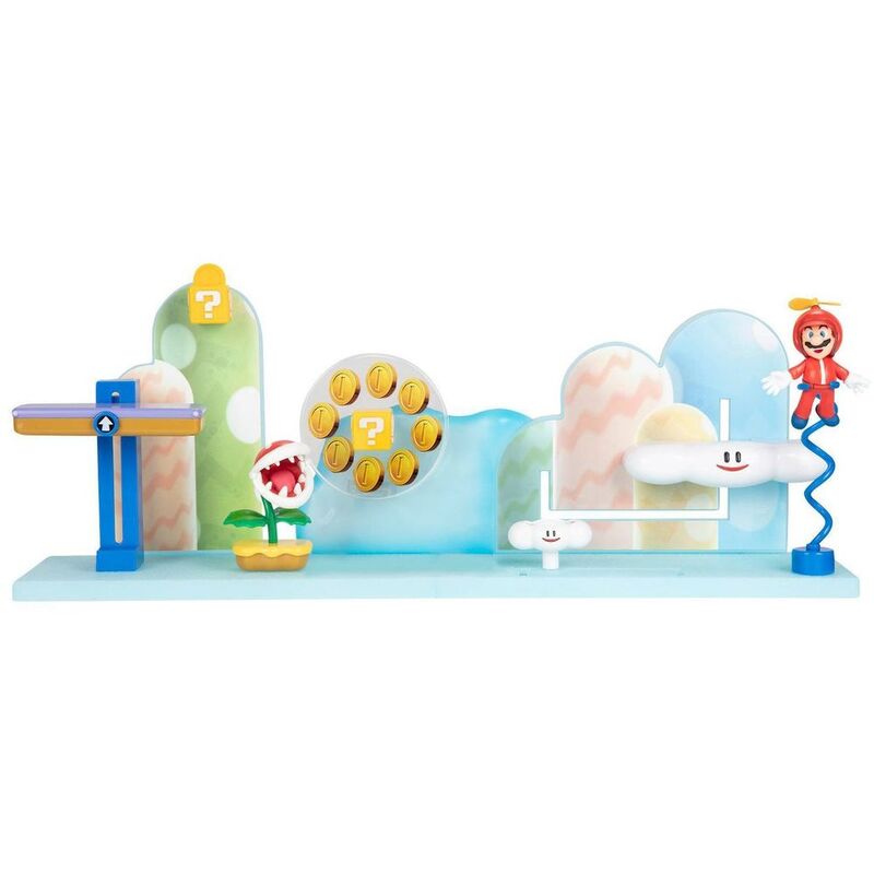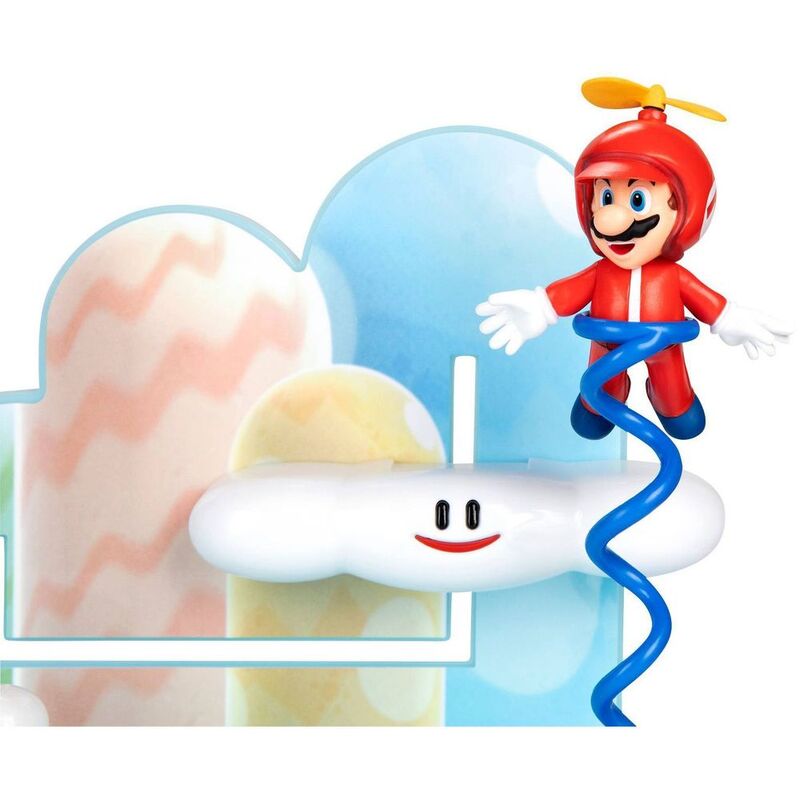 Create your own adventures with the included two-and-a-half-inch Propeller Mario figure and navigate him through the many obstacles. Included in this playset are six interactive environment pieces with working mechanisms. Spin Propeller Mario on the spiral stand and jump from cloud to cloud collecting coins but watch out for the chomping Piranha Plant!