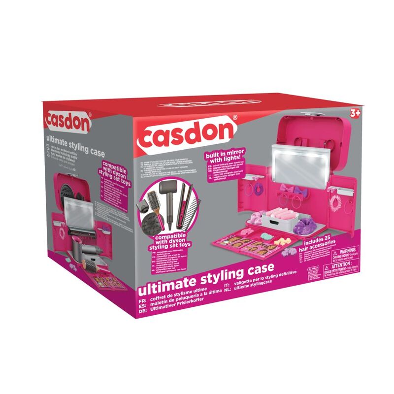 Foldable pink and silver styling case that includes a built-in mirror, double-sided styling cards and 25+ hair accessories. compatible with other styling toys in the dyson range. requires 3 x AAA batteries (not included). suitable for ages 3+