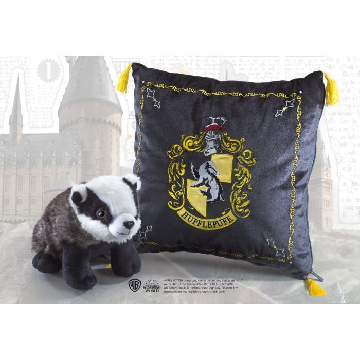 Measuring approximately 34cms square, this embroidered Hufflepuff house crest cushion contains a plush of the Hufflepuff badger mascot as featured in the Harry Potter films.