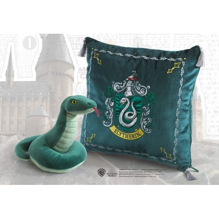 Measuring approximately 34 cms square, this embroidered Slytherin house crest cushion contains a plush of the Slytherin snake mascot as featured in the Harry Potter films.