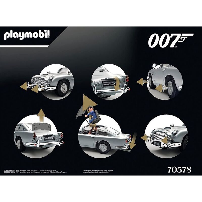 The name's Bond. James Bond - the world's most famous secret agent. For nearly sixty years, the adventures of 007 have thrilled fans all over the world. Each new assignment is an action-packed adventure fueled with amazing stunts, breathtaking car chases, and all of the latest gadgets. In his third on-screen appearance in Goldfinger (1964), James Bond drives the iconic Aston Martin DB5 for the first time. This silver Aston Martin comes with authentic gadgets including revolving number plates, a passenger ejector seat, and much more. In this timeless vehicle, 007 out runs all of his pursuers in a spectacular chase and then thwarts the plans of villain Auric Goldfinger. This PLAYMOBIL set is a must have for all Bond fans! The set includes James Bond, Goldfinger, Oddjob, and Henchman, and the iconic car that seats two figures. With removable roof.