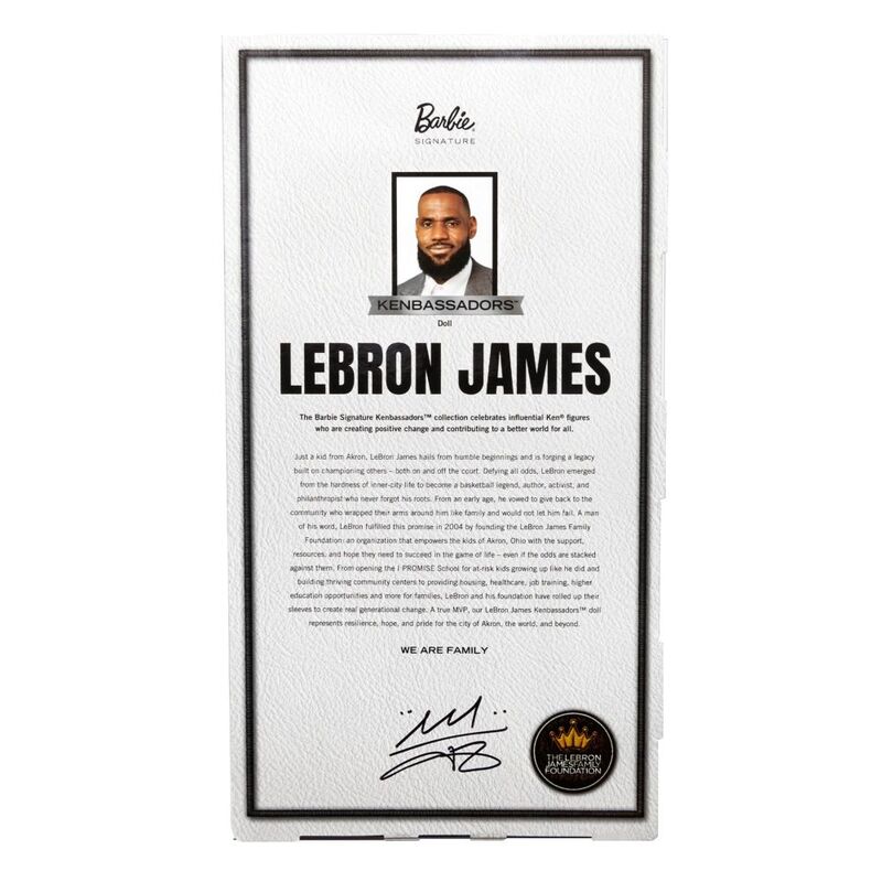 As the first doll in the Barbie Signature Kenbassadors line, Mattel is proud to introduce: LeBron James. He's a true leader - an activist, philanthropist, and champion for others both on and off the court. A changemaker and tastemaker, this LeBron James Ken doll embodies his signature elevated streetwear style while proudly representing the LeBron James Family Foundation, his nonprofit dedicated to empowering inner-city youth with the tools they need to succeed in life.