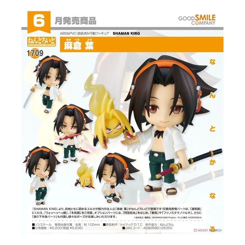 From "SHAMAN KING" comes a Nendoroid of the series' laidback and carefree protagonist Yoh Asakura! He comes with three face plates including a standard expression, a relaxed smiling expression and a serious expression.Optional parts include a miniature figure of his Guardian Ghost Amidamaru, his sword Harusame, his sword Antiquity and an interchangeable lower body part. Be sure to add him to your collection!