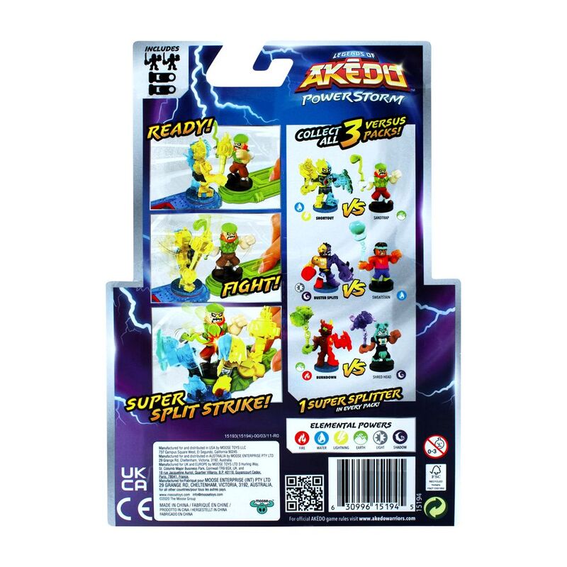 Get ready for some "Elemental Battle Action"! The Legends of Akedo Power Storm is back! The Akedo Warriors are ready to battle with new weapons, fighting styles and game play! Each Battling Warrior is power-boosted by one of the six elements: Earth, Fire, Water, Light, Shadow and Lightning! There are Classic, Epic, Ultra Rare, Legendary and NEW Super Splitters to collect. Super Splitters have the combined powers of two elements and right through their bodies!. Players can start battling straight out of the box with the Akedo Power Storm Versus Pack. With everything they need to battle with their friends, the Versus Pack includes 2 warriors - Shortout: A Super Splitter who has the combined powers of two elements and Sandtrap, plus 2 Battle Controllers. There are three Akedo Power Storm Versus Packs to collect in Series 4, each with an awesome grudge match waiting to occur! Ready! Fight! Split Strike!