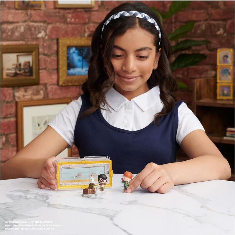 Relive memorable Year 1 movie moments from Harry Potter and the Sorcerer's Stone with the Wizarding World Micro Magical Moments figure sets! This multipack comes with 1.5-inch figures of Harry Potter, Ron Weasley and Hedwig, a clear portrait frame display case, and three figure stands.